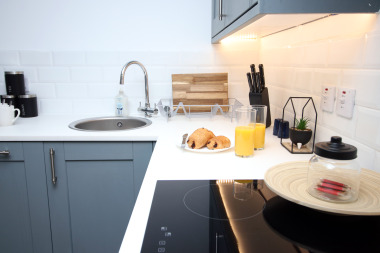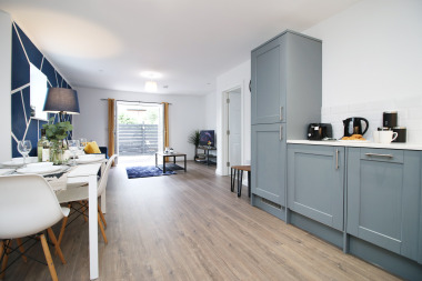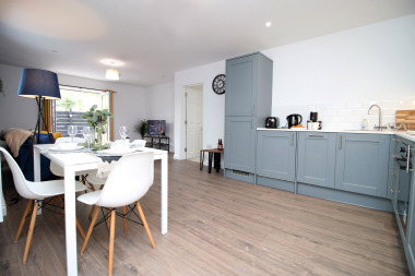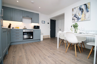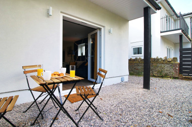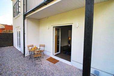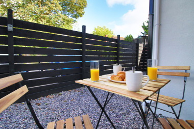 This is a ground floor apartment so there is no need to worry about any stairs. Easy access for guests with luggage or disabilities as we offer a back entrance direct into the apartment to avoid steps round the front of the main building. An outdoor seating area with table and chairs is available off the living room, through patio doors. Smoking is only permitted outside.