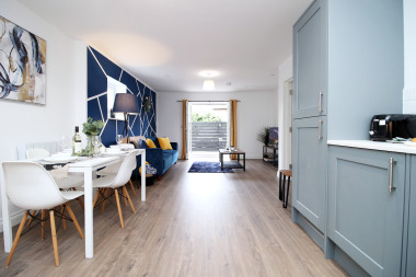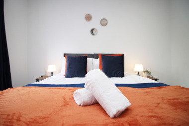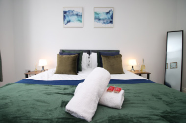 This apartment has a king size bed in each room that can be split into singles if requested, please make us aware at the time of booking if you require singles. The sofa in the living room can be turned into a sofa bed if needed, please inform us if needed as bedding is provided. The kitchen provides a washing machine, fridge freezer, dishwasher microwave oven and a spacious dining table.